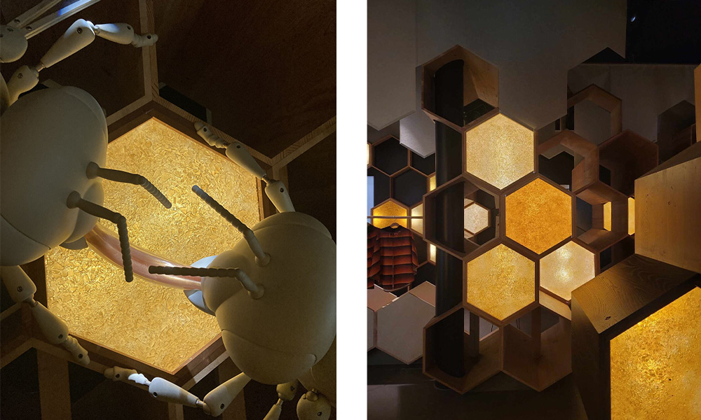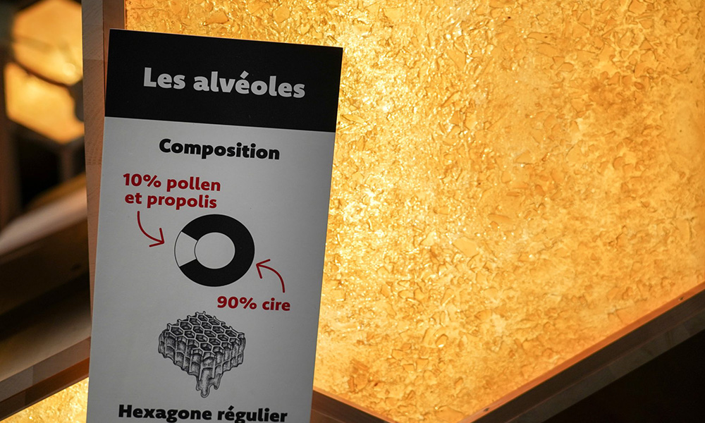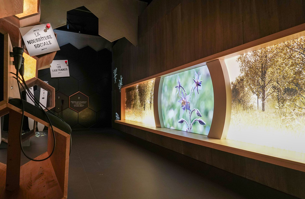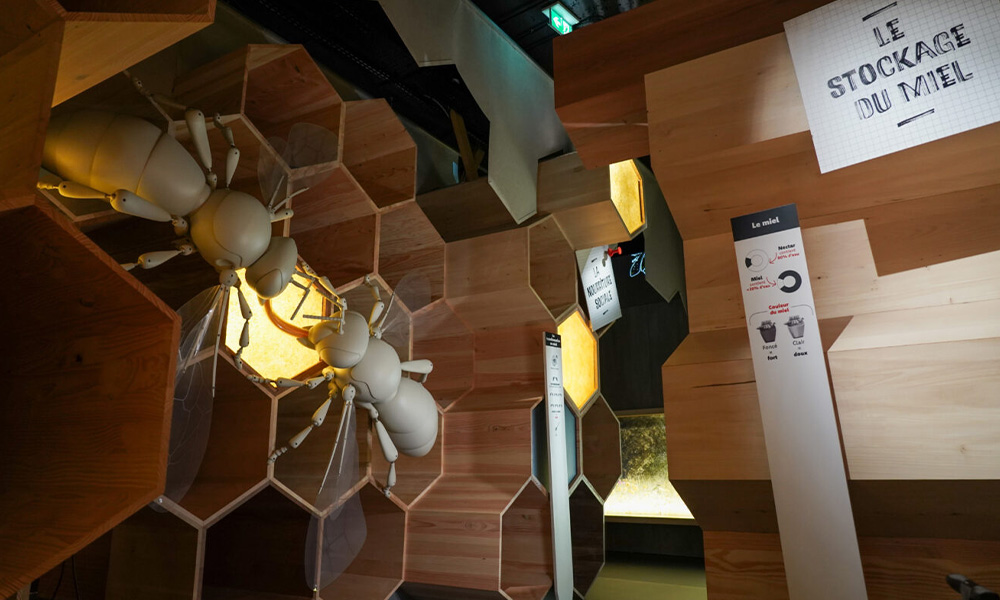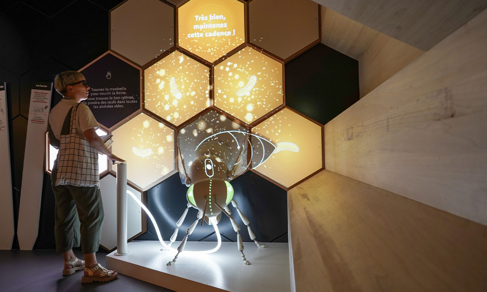 Cette nouvelle scénographie immersive et pédagogique accompagne le parcours de visite en proposant des éléments adaptés à tous les publics, au service de la découverte du monde des abeilles et du fonctionnement de la ruche.