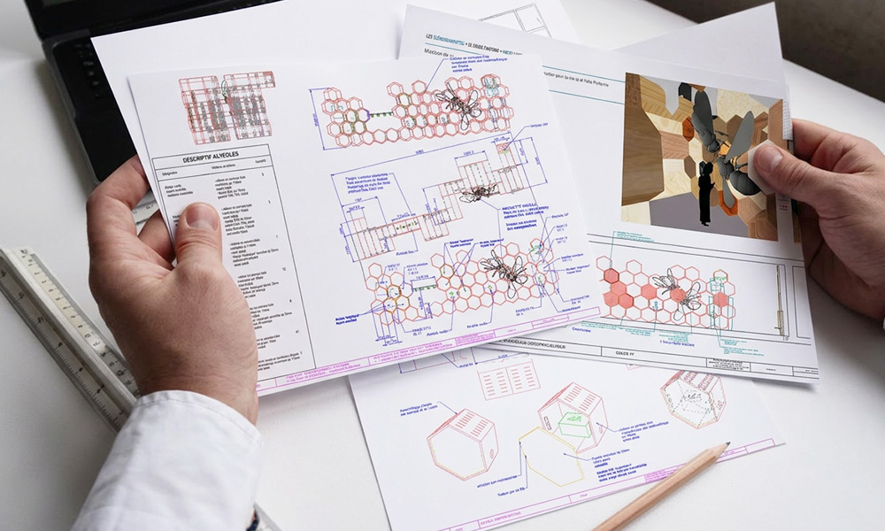 Développement d’un ensemble de mobilier d’exposition sur-mesure pour La Nouvelle Ruche Géante, au parc La Folie de Finfarine, en collaboration avec l’agence Les Scénographistes.